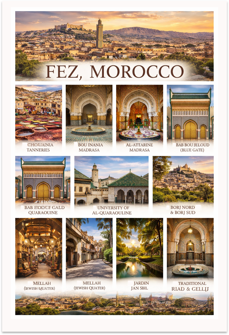 Fez is Morocco’s cultural and spiritual capital, celebrated as one of the world’s most authentic historic cities. Its UNESCO-listed Medina, the largest and best-preserved medieval urban area still in use, offers a living journey through winding alleys, vibrant souks, and centuries-old craftsmanship. Home to Al-Quaraouiyine, the world’s oldest continuously operating university, Fez has long been a center of learning, faith, and intellectual exchange. From the intricate beauty of its madrasas and riads to the iconic Chouara Tanneries and Royal Palace gates, the city reveals a rich imperial heritage at every turn. Deeply rooted in tradition yet alive with daily life, Fez stands as a timeless destination for travelers seeking authenticity, culture, and historical depth.
